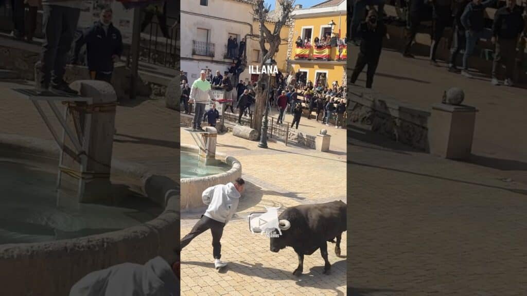 Saeta uno de los toros de la nostalgia sube y baja las escaleras de la plaza mayor en “Illana” Guadalajara. #vivelosencierros