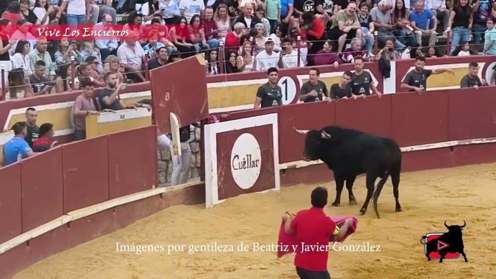 Un toro levanta una talanquera hasta por dos ocasiones mientras se celebraba la final del concurso de recortadores en la localidad segoviana de Cuéllar, el viernes 29 de agostos de 2025.
