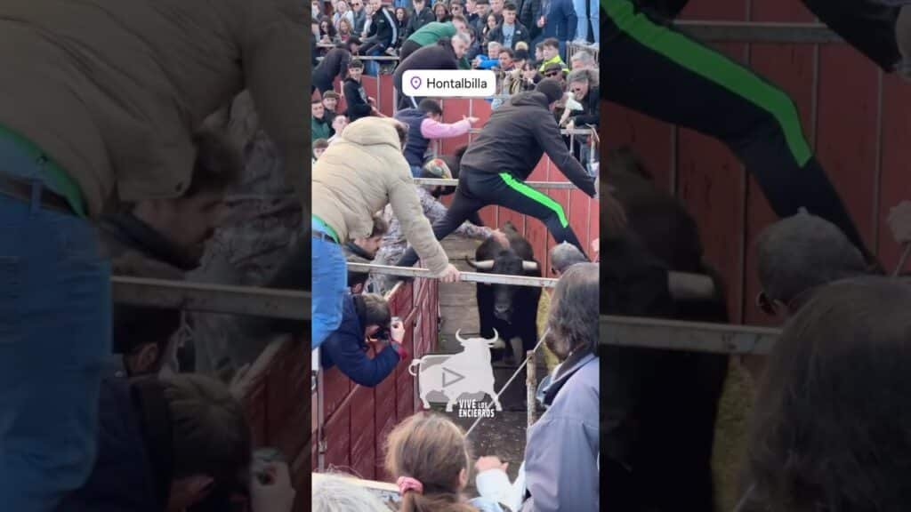 Un hombre no puede subir a la talanquera y el toro le ayuda a subir en Hontalbilla #vivelosencierros