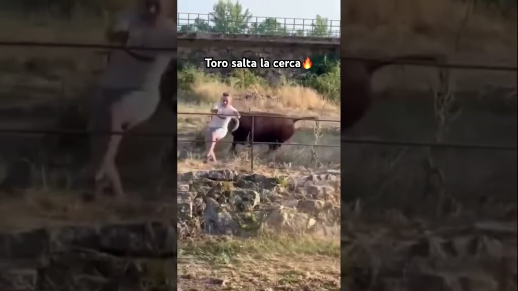 Un toro bravo de Cebada Gago persigue a un corredor por el camino del encierro. El toro Se desvía de su trayectoria y salta una cerca donde se encontraba una persona fuera de esta y por un instante de tensión por poco es alcanzado.